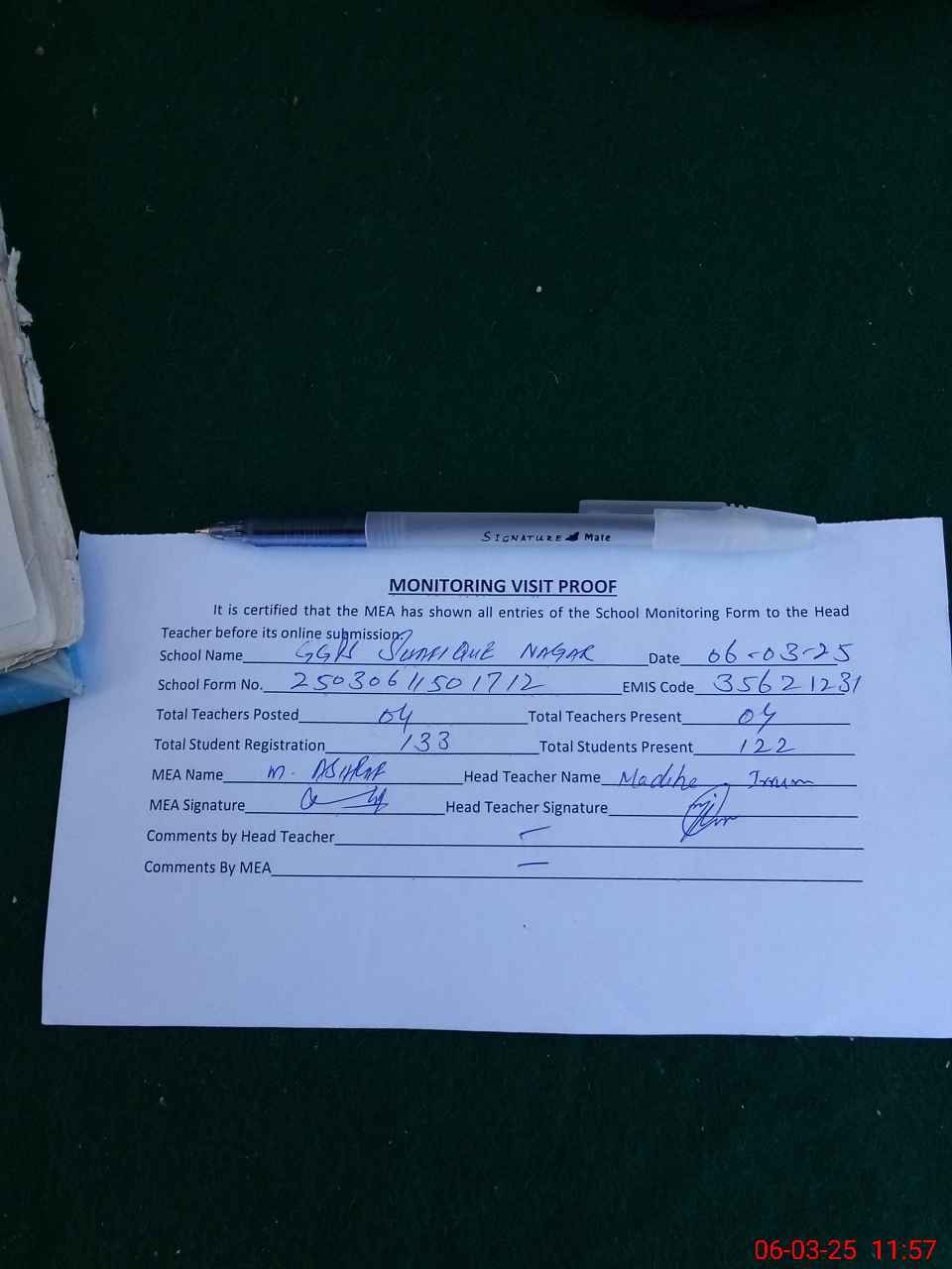 | Attendance Register | Head Teacher | MEA with School | Visit Proof |