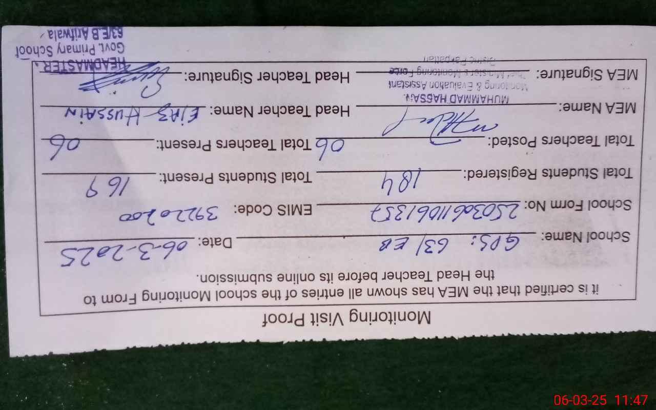 | Attendance Register | Head Teacher | MEA with School | Visit Proof |