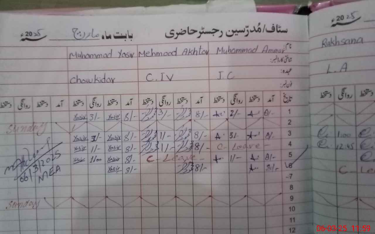 | CNIC | Full Name | Designation | R/C | Absence During Last Calender Month |