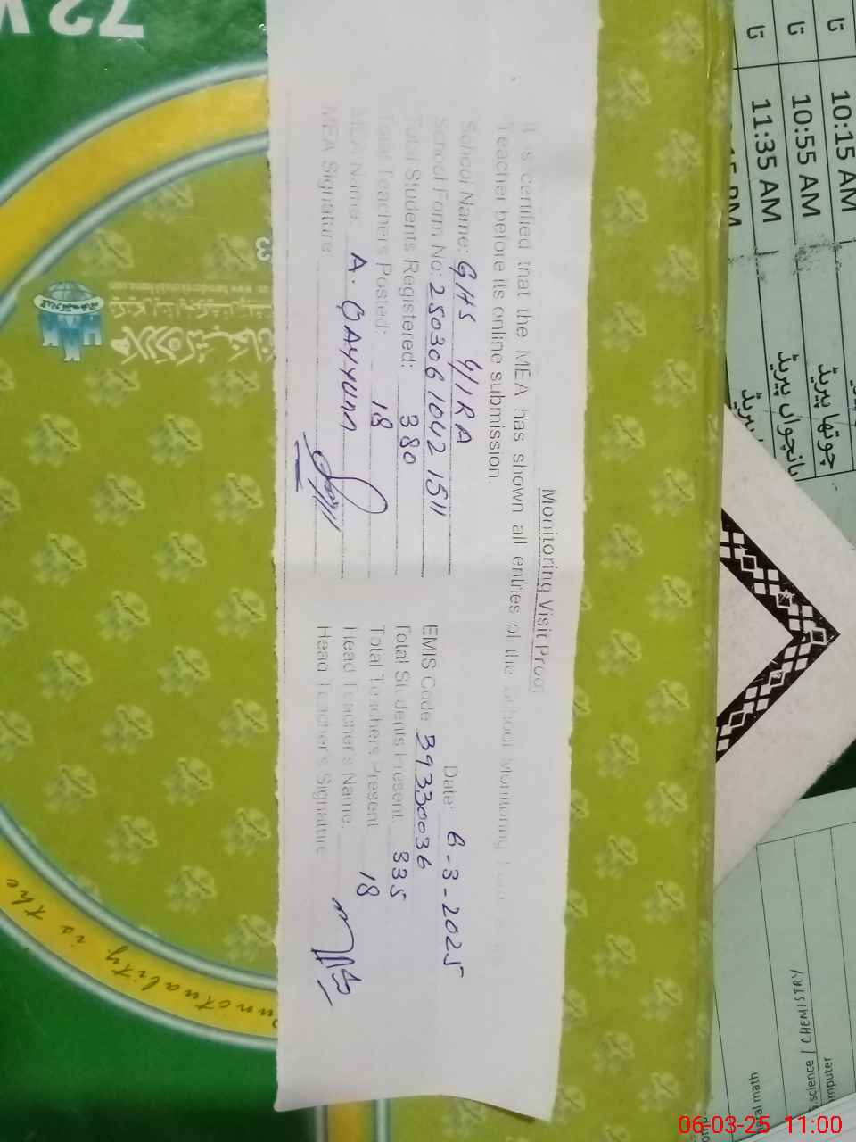 | Attendance Register | Head Teacher | MEA with School | Visit Proof |