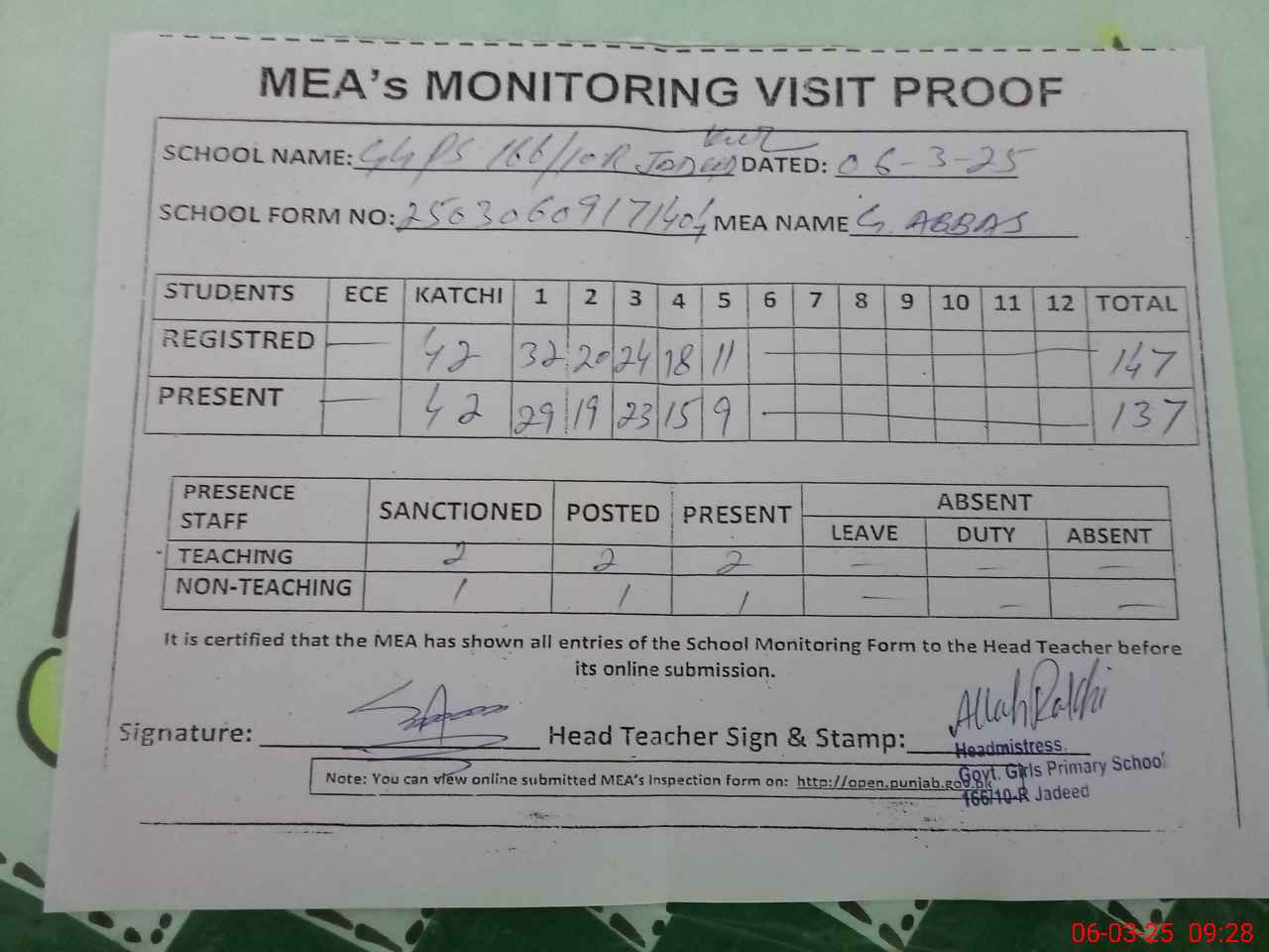| Attendance Register | Head Teacher | MEA with School | Visit Proof |