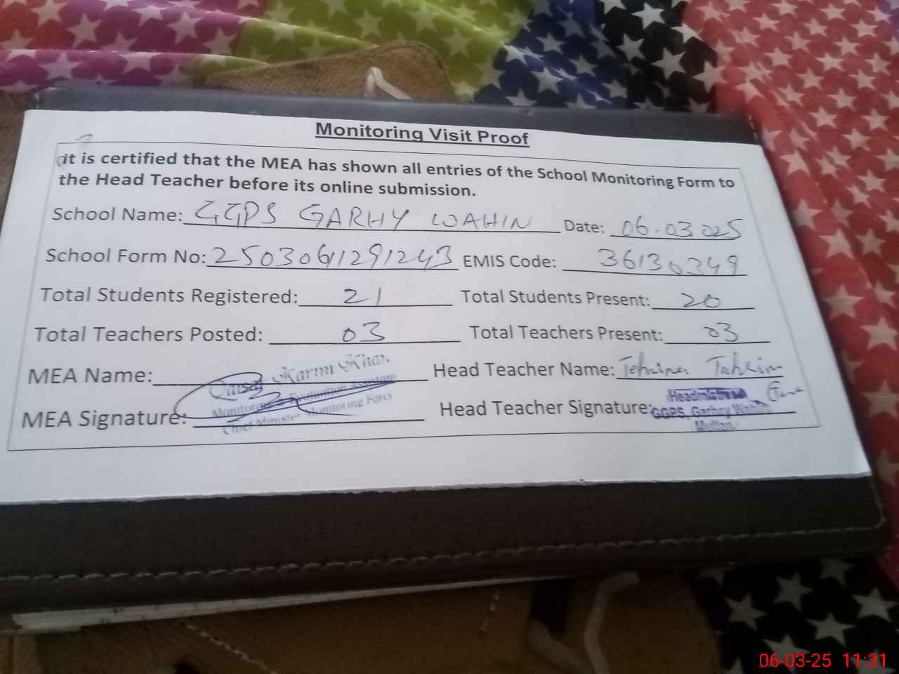 | Attendance Register | Head Teacher | MEA with School | Visit Proof |