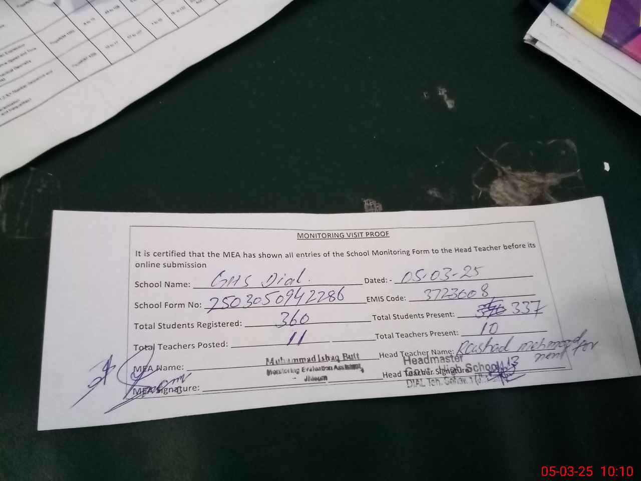 | Attendance Register | Head Teacher | MEA with School | Visit Proof |