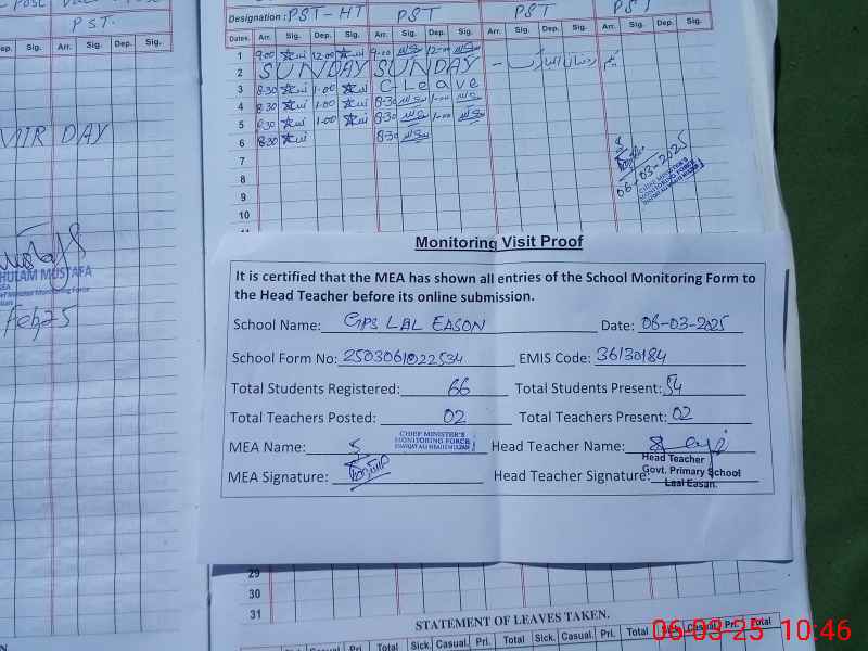 | Attendance Register | Head Teacher | MEA with School | Visit Proof |