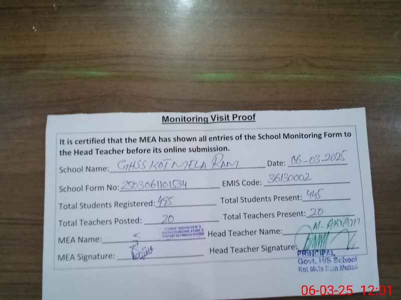 | EMIS Code: 36130002 | Name of School: GHSS KOT MELA RAM RAILWAY STATION MULTAN | |||