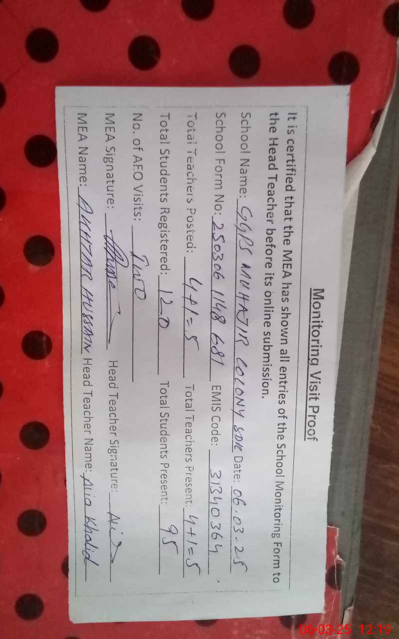 | Certified that this School was Inspected by the Undersigned MEA/DMO Today and the Information Stated Above is as Per Record. | |||||