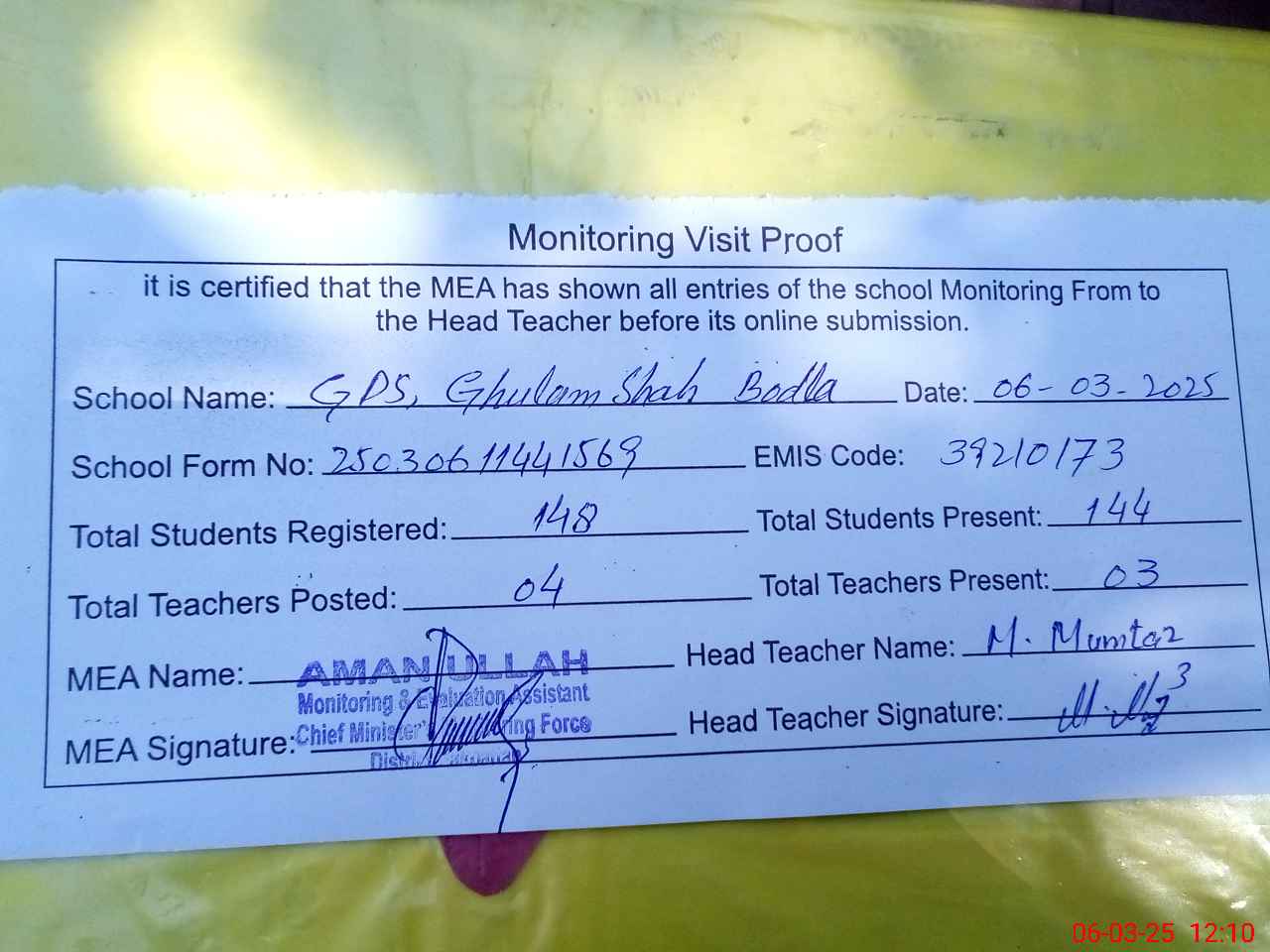 | Attendance Register | Head Teacher | MEA with School | Visit Proof |