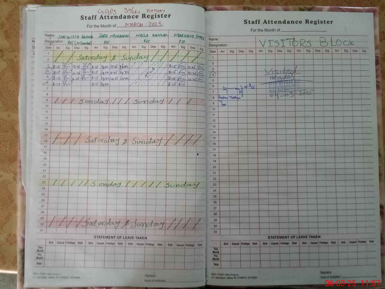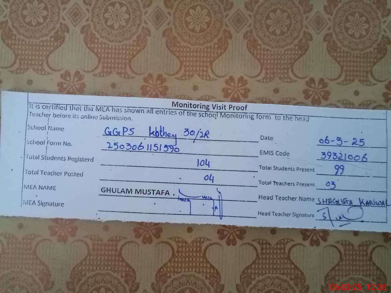 | Attendance Register | Head Teacher | MEA with School | Visit Proof |