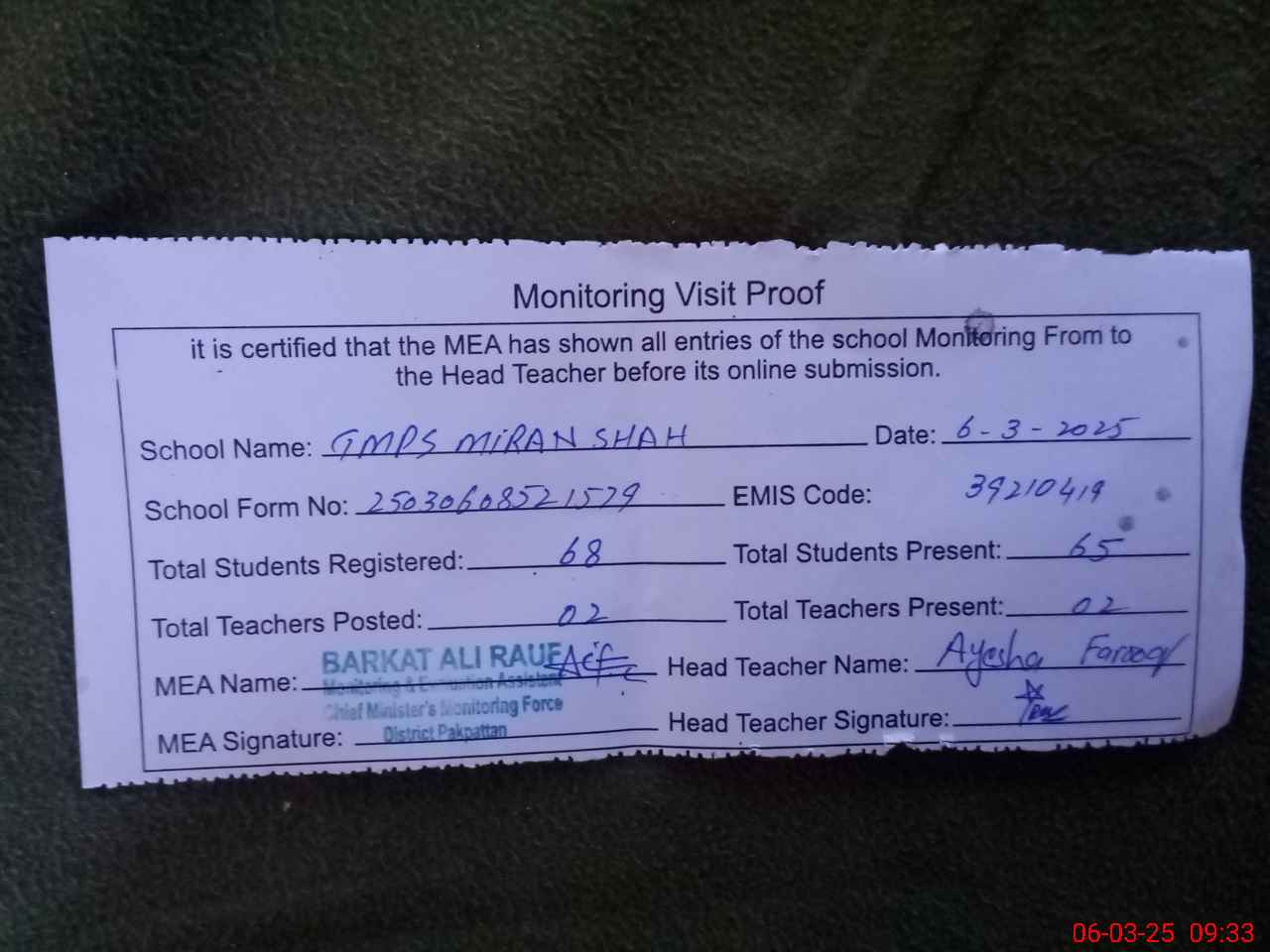 | EMIS Code: 39210419 | Name of School: GMPS CHAK MIRAN SHAH | |||