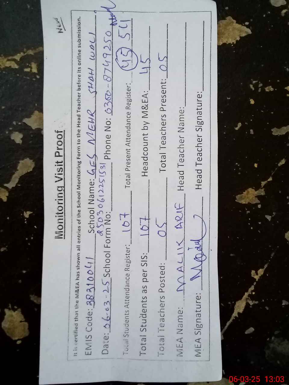 | Attendance Register | Head Teacher | MEA with School | Visit Proof |