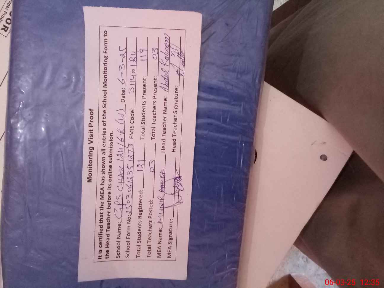 | Attendance Register | Head Teacher | MEA with School | Visit Proof |