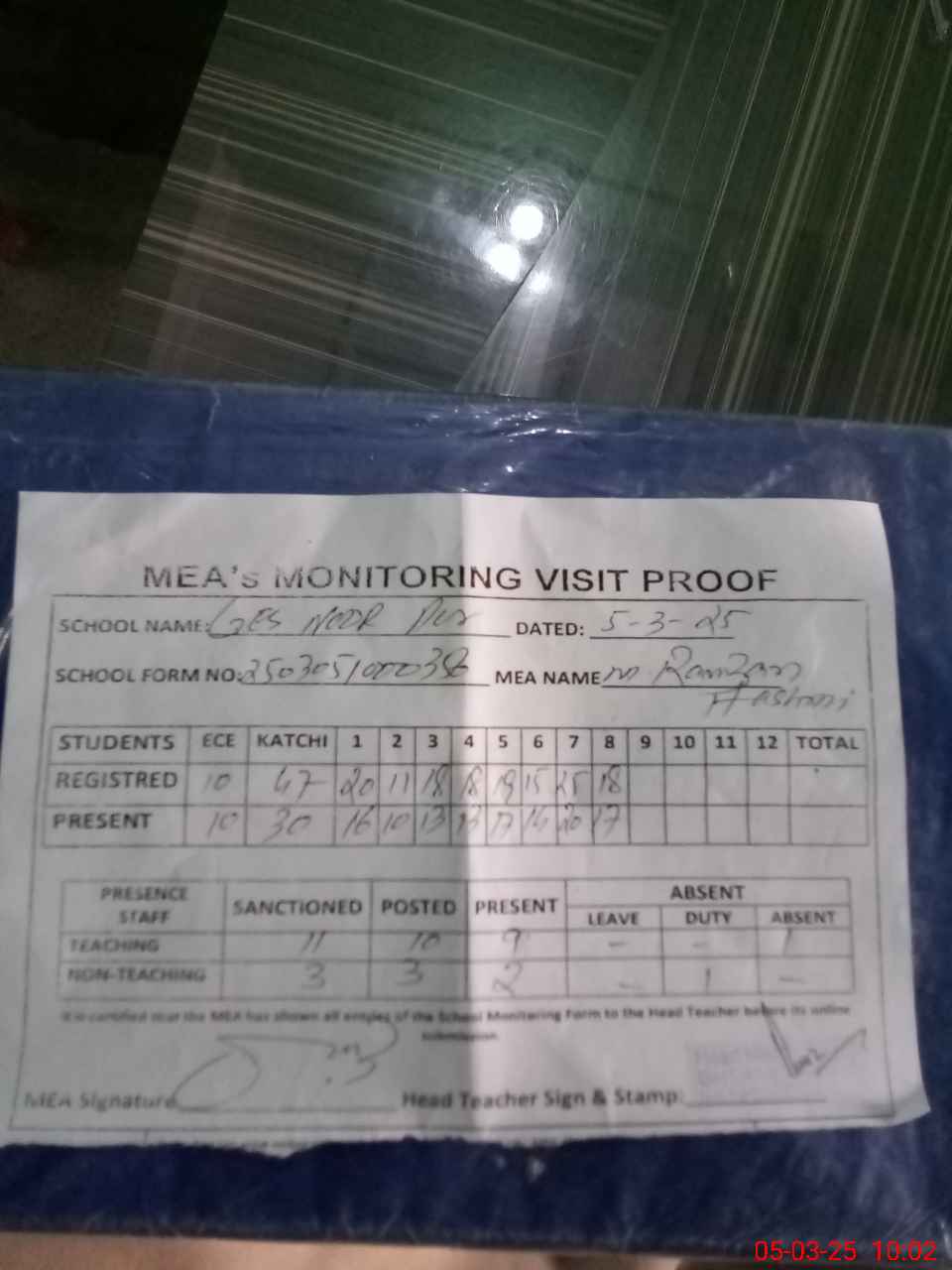 | Attendance Register | Head Teacher | MEA with School | Visit Proof |