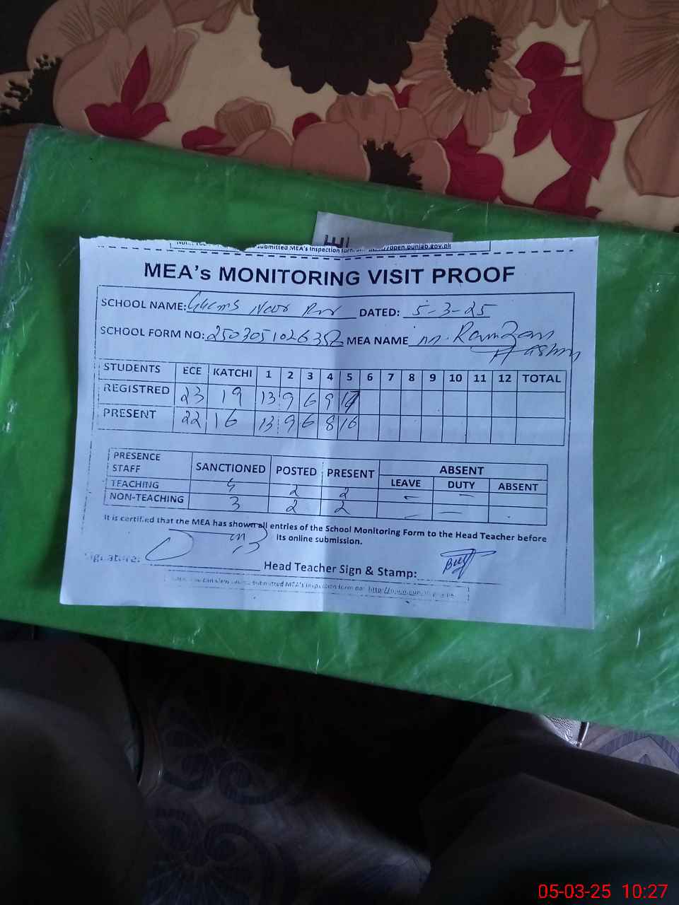 | Attendance Register | Head Teacher | MEA with School | Visit Proof |