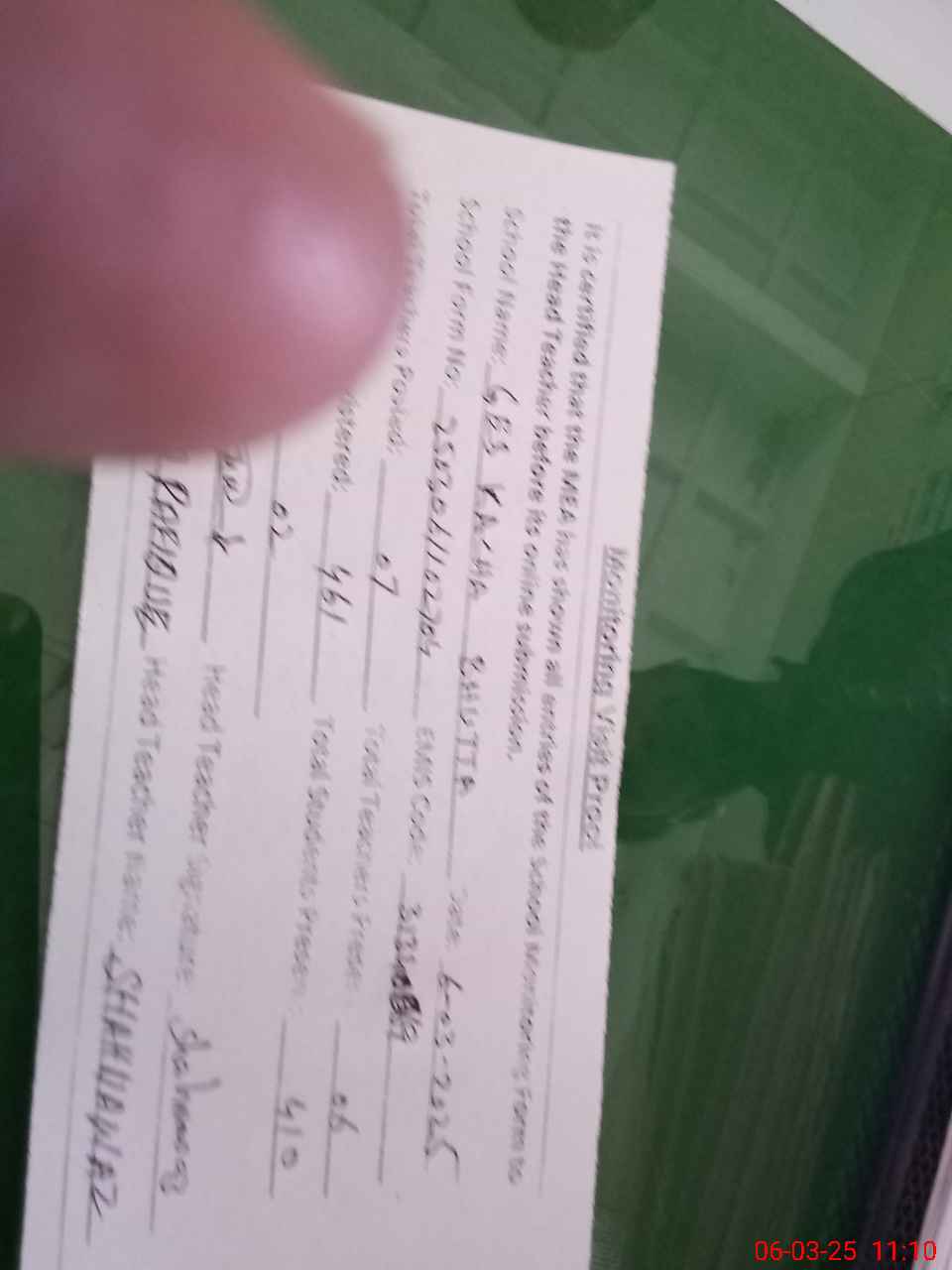 | Name: Sh**** Na**** Designation: (School Headmaster's/Headmistress's) EST Phone/Cell Number: 03**** |