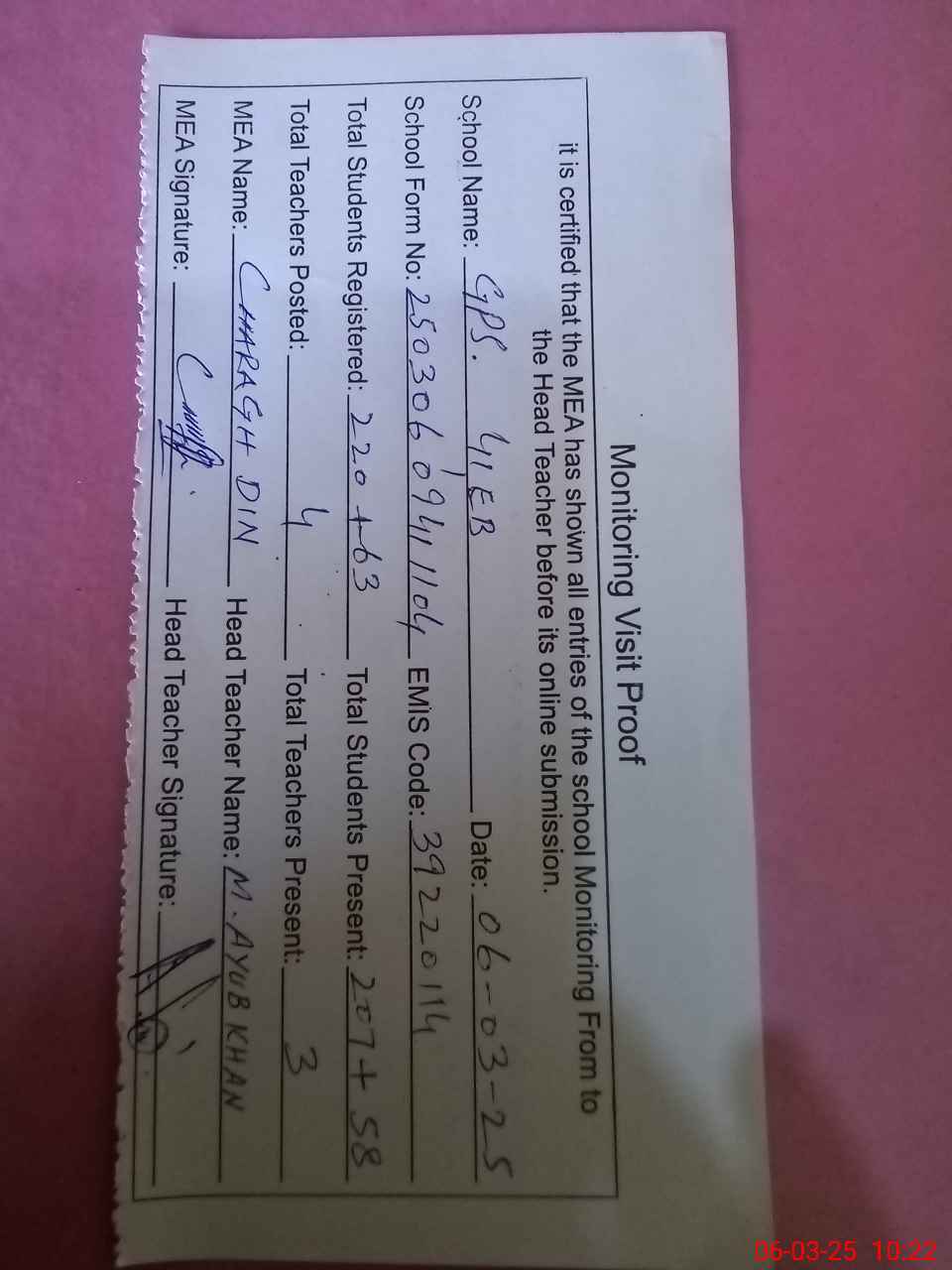 | Attendance Register | Head Teacher | MEA with School | Visit Proof |