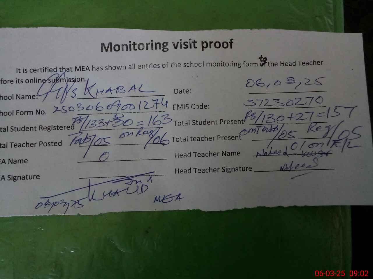 | Attendance Register | Head Teacher | MEA with School | Visit Proof |