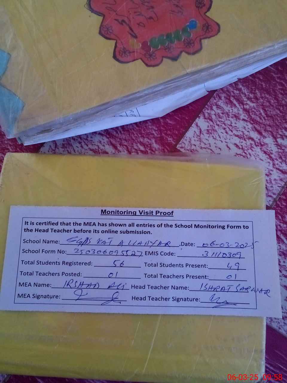 | EMIS Code: 31110309 | Name of School: GGPS KAT ALLAH YAR | |||