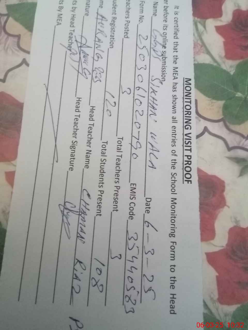 | Attendance Register | Head Teacher | MEA with School | Visit Proof |