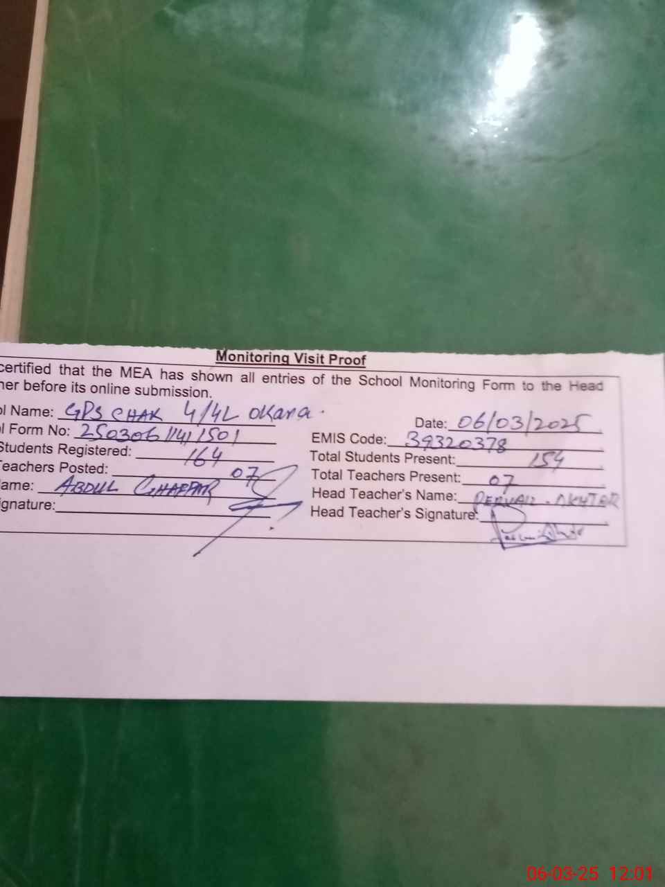 | Attendance Register | Head Teacher | MEA with School | Visit Proof |