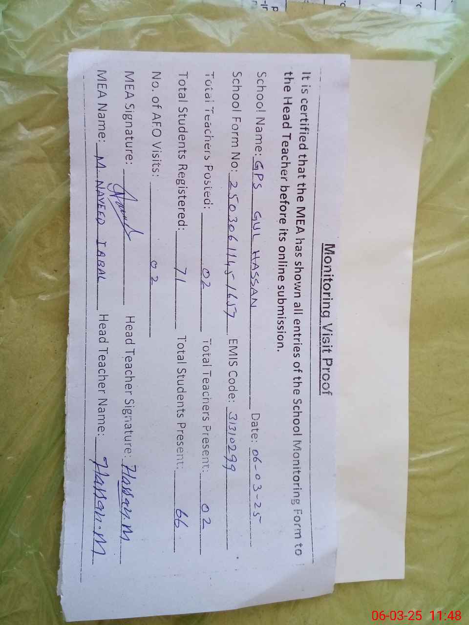 | Attendance Register | Head Teacher | MEA with School | Visit Proof |