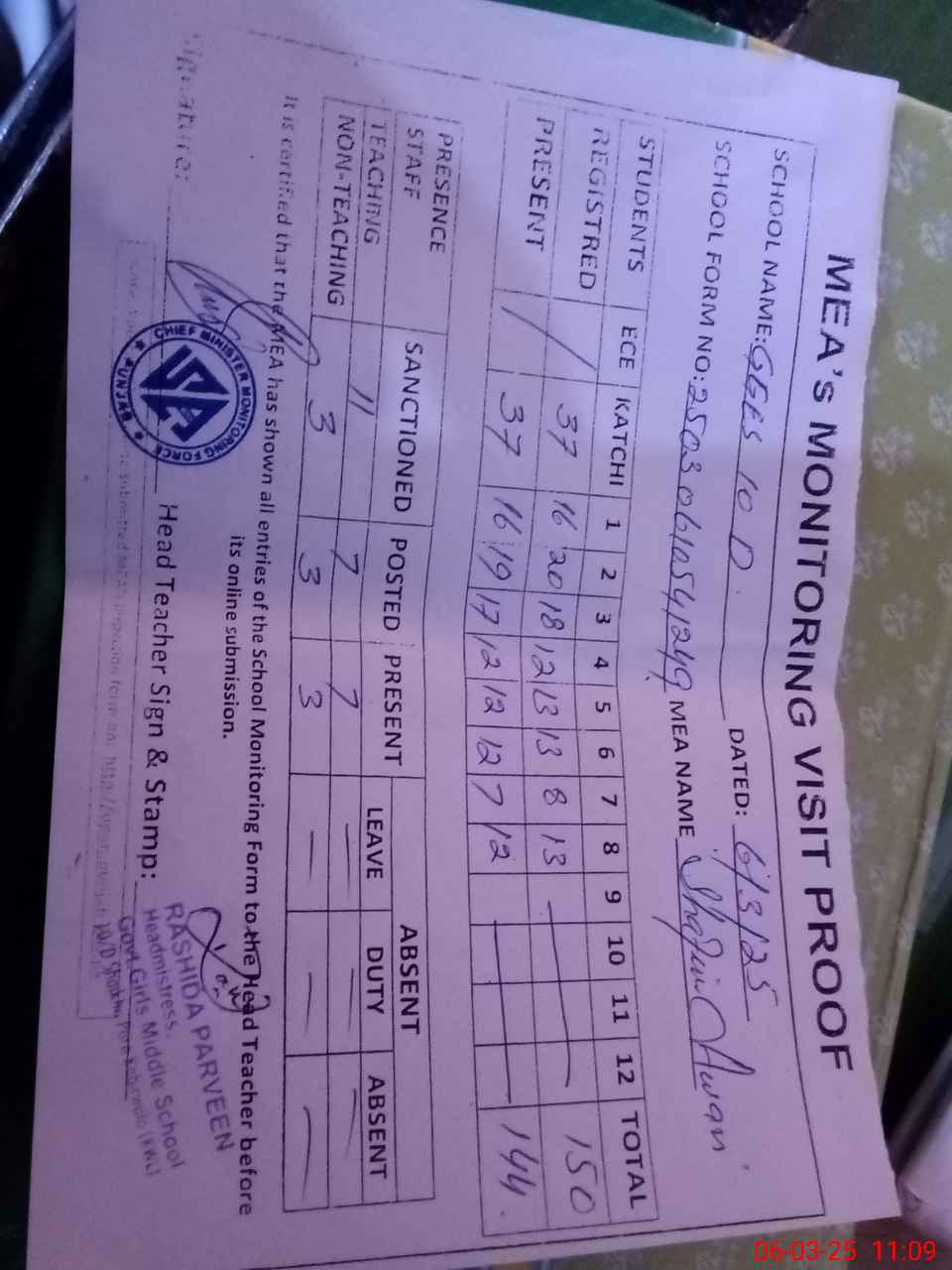 | Attendance Register | Head Teacher | MEA with School | Visit Proof |