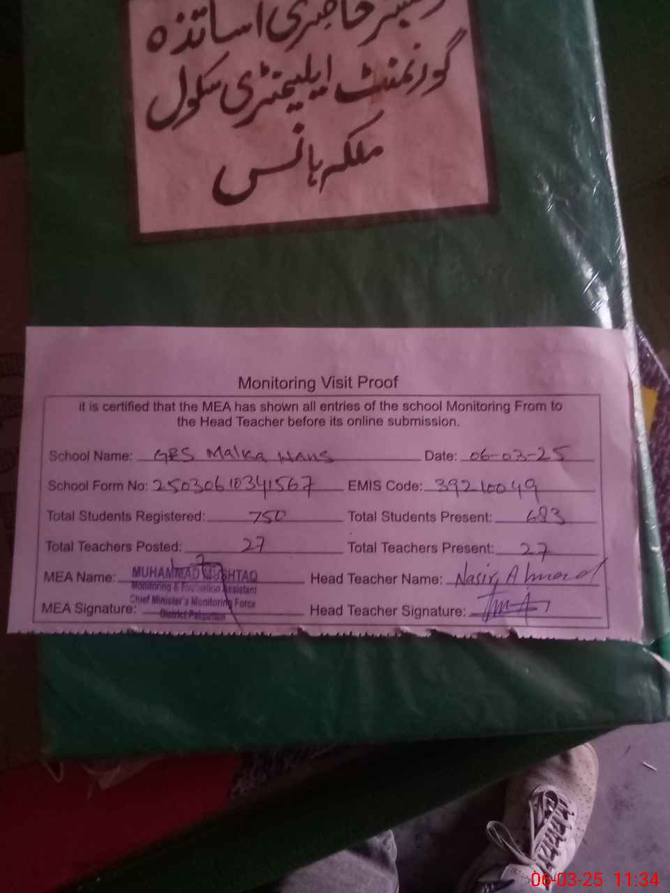 | Attendance Register | Head Teacher | MEA with School | Visit Proof |