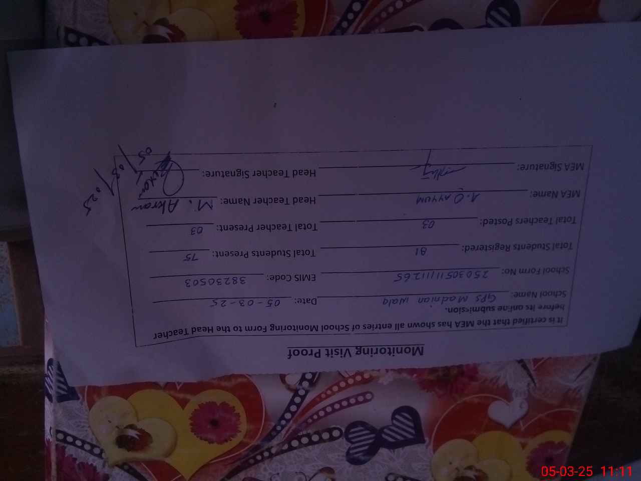 | Certified that this School was Inspected by the Undersigned MEA/DMO Today and the Information Stated Above is as Per Record. | |||||