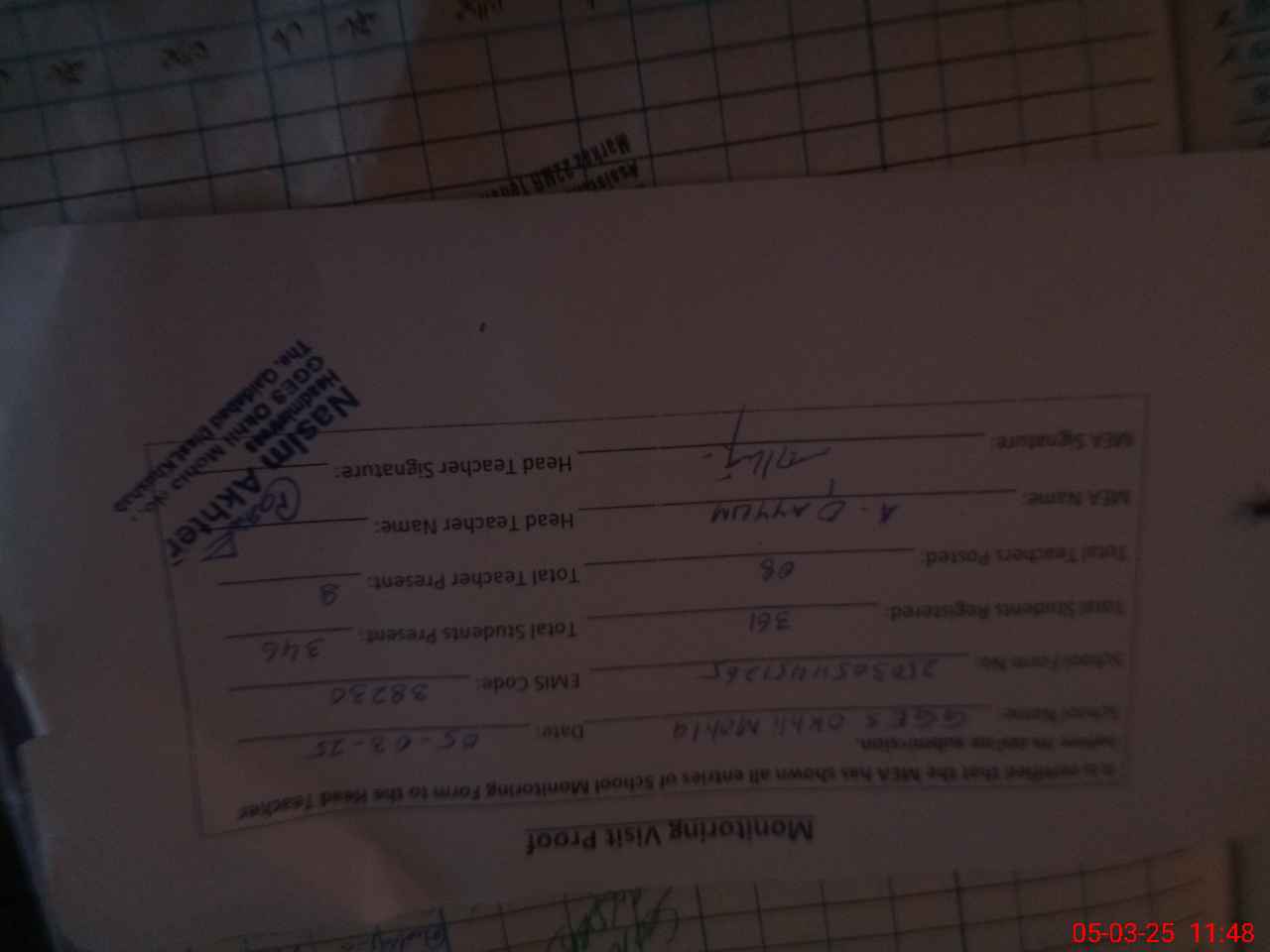 | Attendance Register | Head Teacher | MEA with School | Visit Proof |