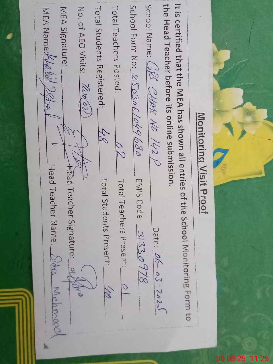 | EMIS Code: 31330978 | Name of School: GPS CHAK NO. 142/P | |||