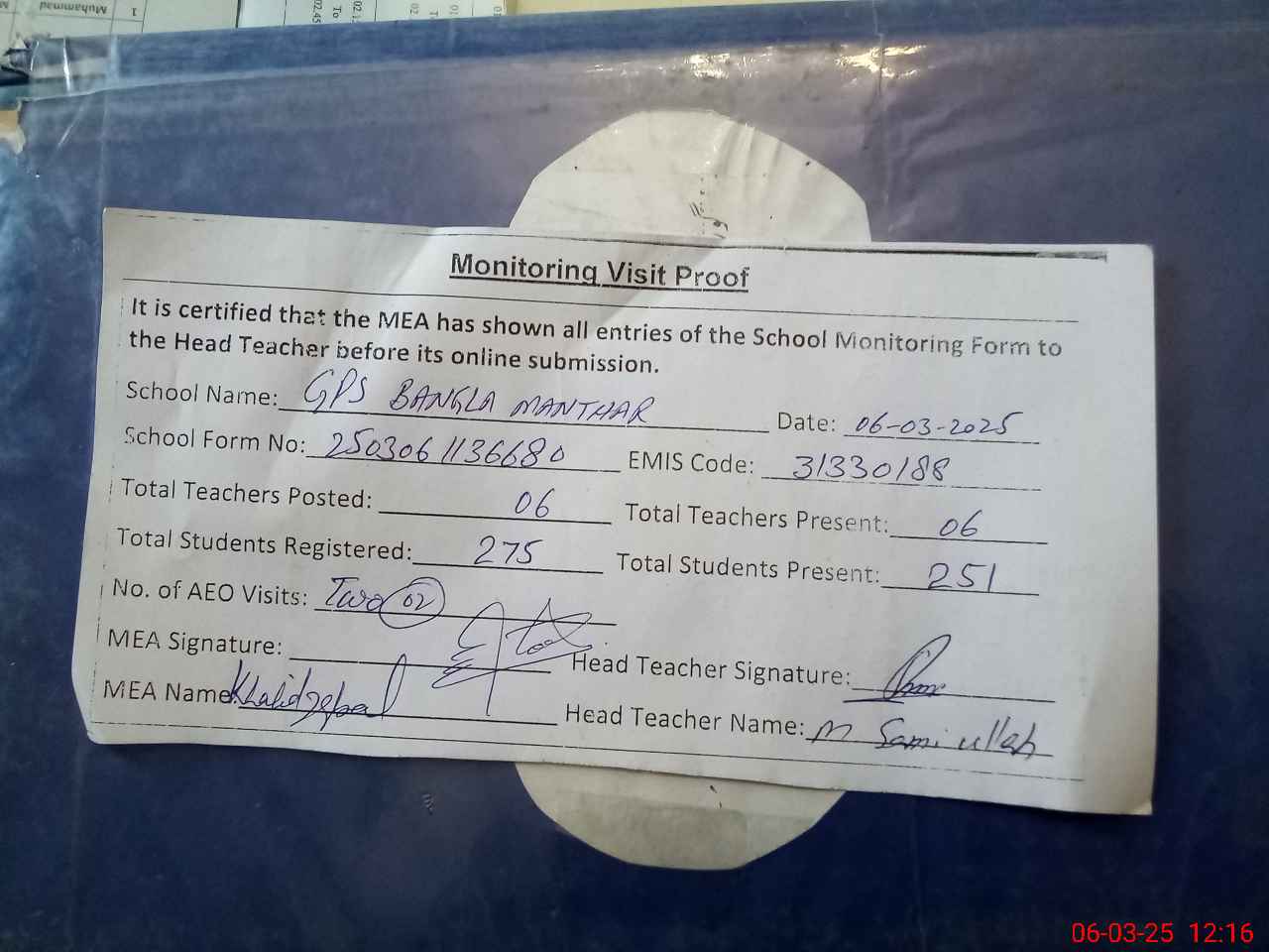 | EMIS Code: 31330188 | Name of School: GPS BANGLA MANTHAR | |||