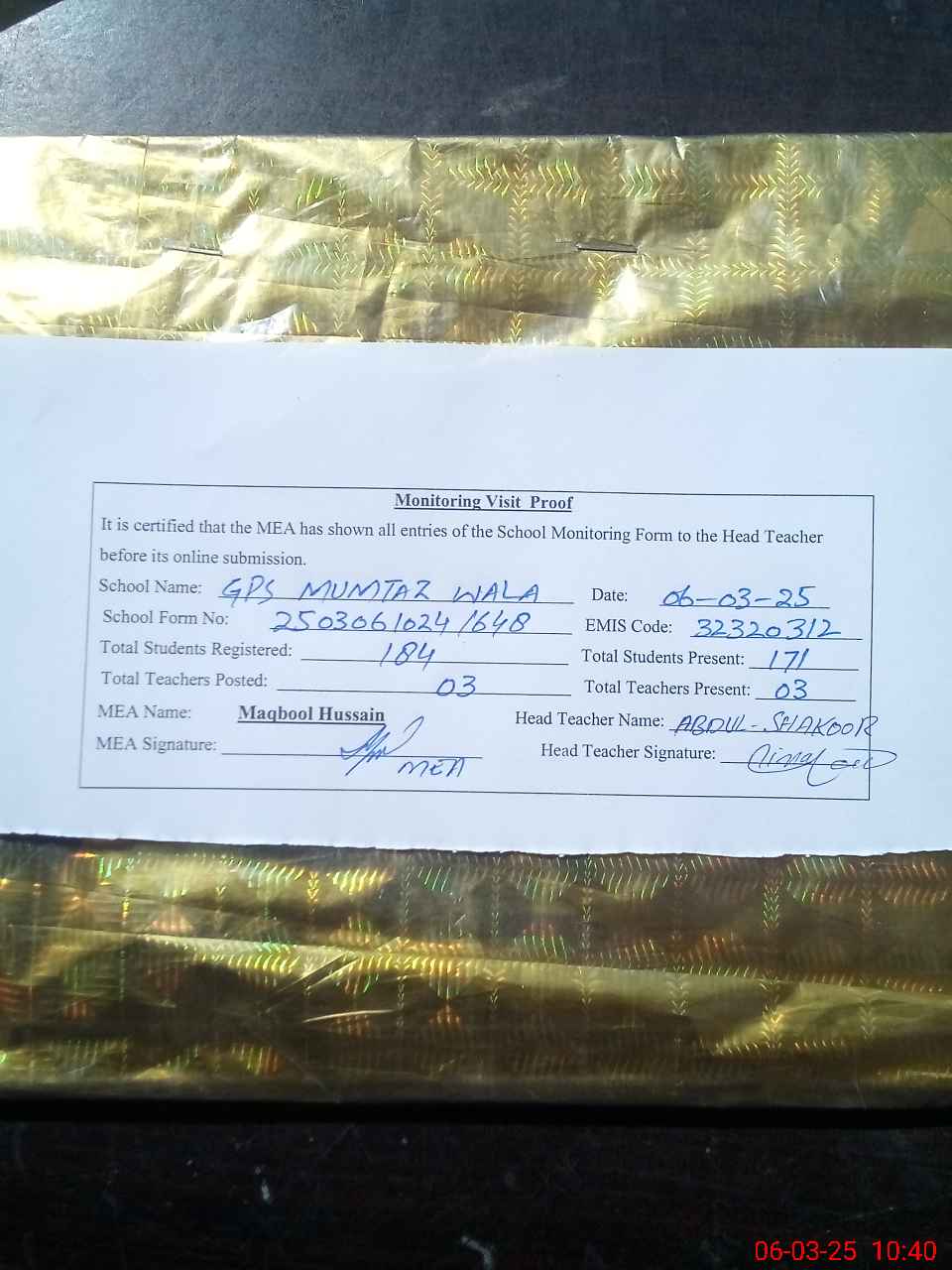 | EMIS Code: 32320312 | Name of School: GPS MUMTAZ WALA | |||