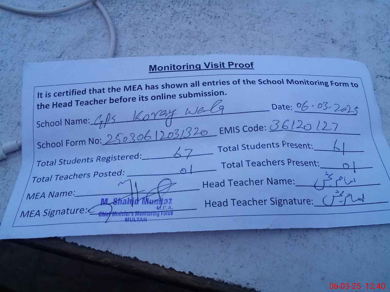| Attendance Register | Head Teacher | MEA with School | Visit Proof |