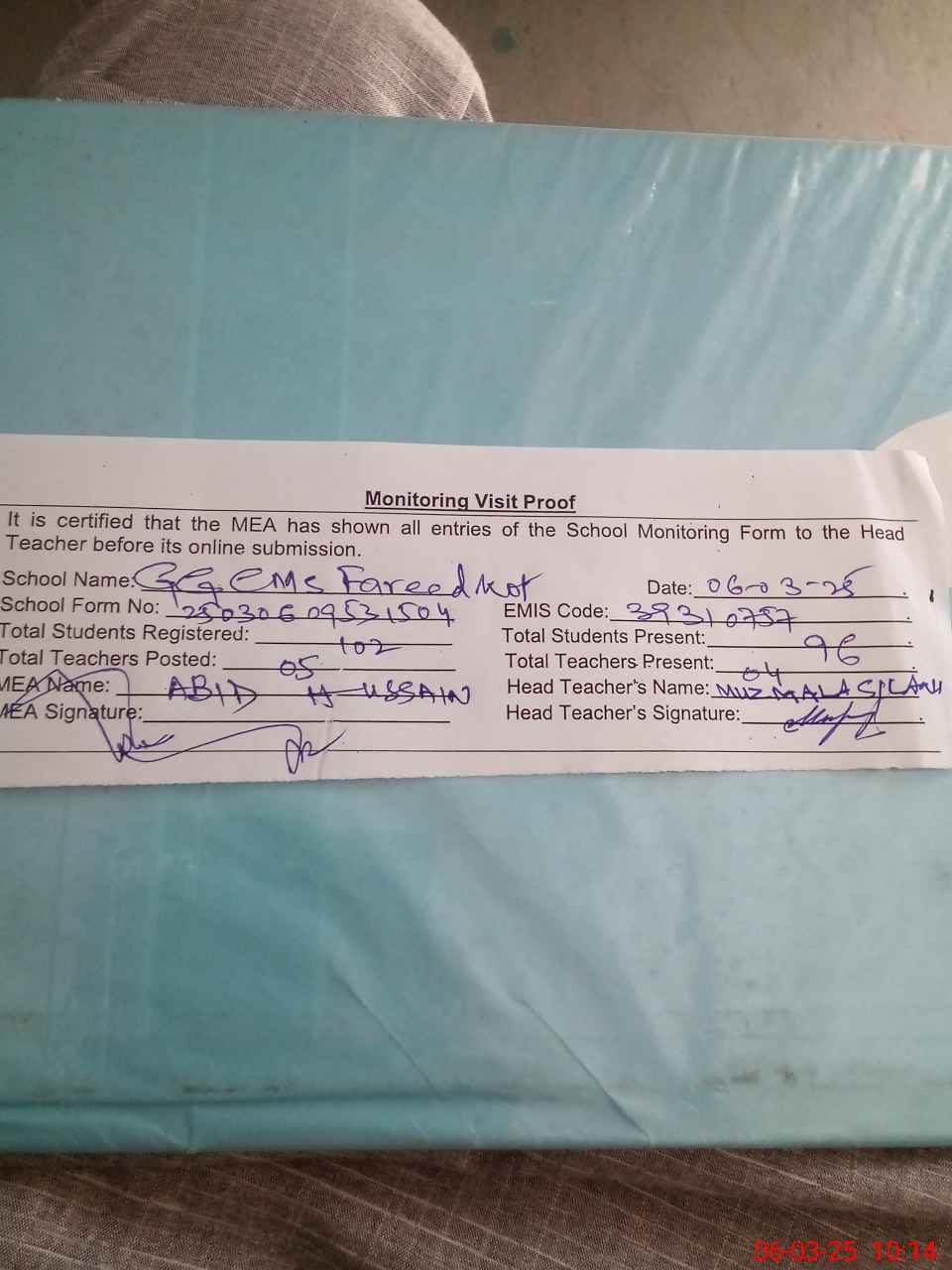 | Attendance Register | Head Teacher | MEA with School | Visit Proof |