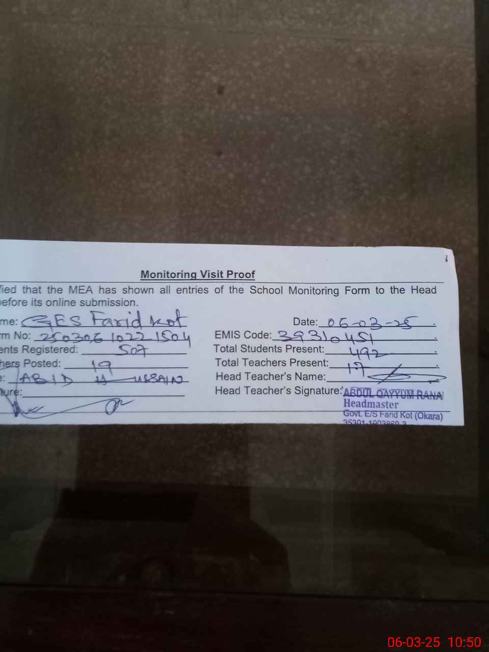 | EMIS Code: 39310451 | Name of School: GES FARID KOT | |||