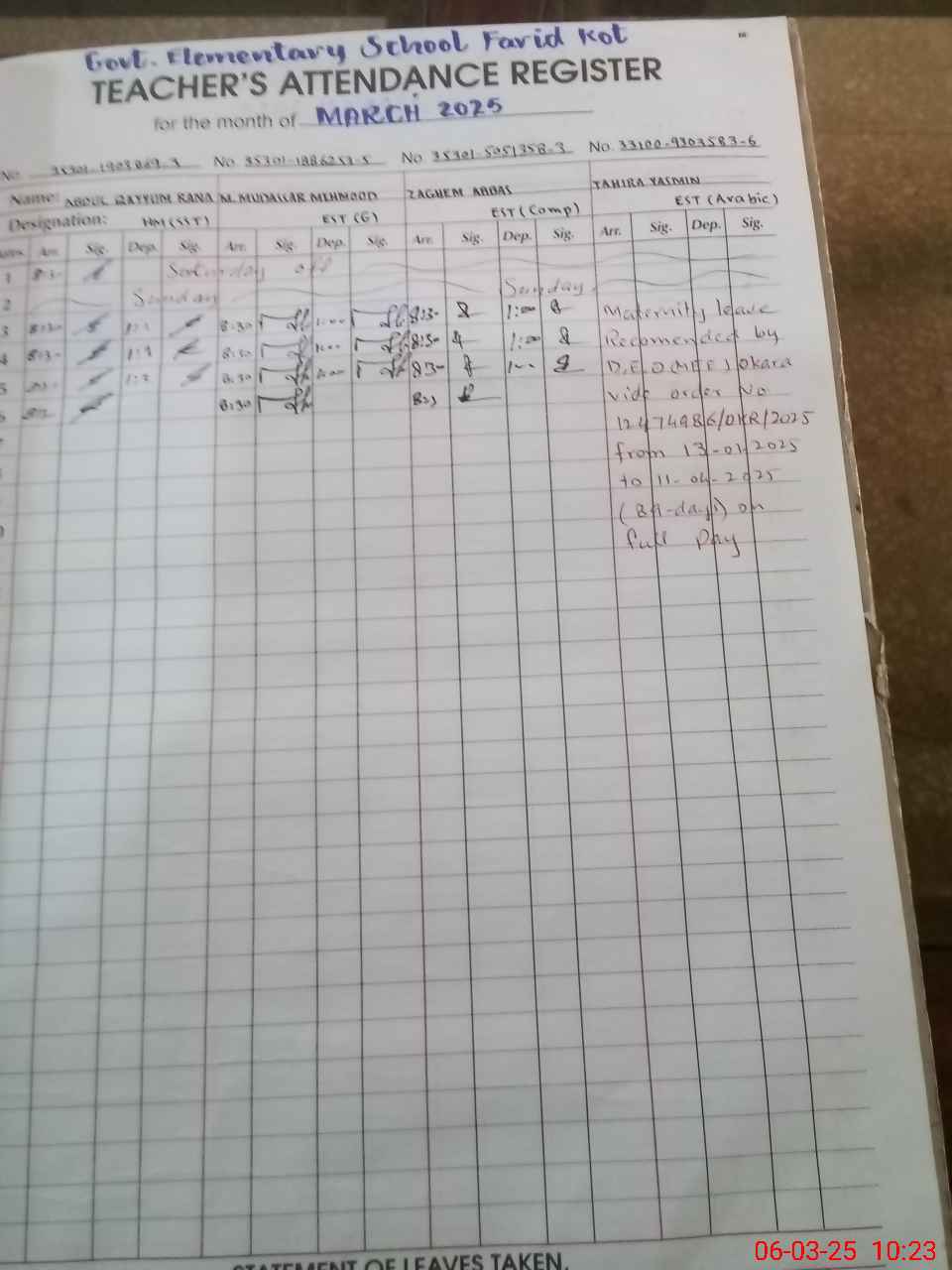 | 33**** | Ta**** Ya**** | Regular | 28 | 0 | 0 | 28 | 0 | 0 | 0 | 0 | 0 | Maternity | |