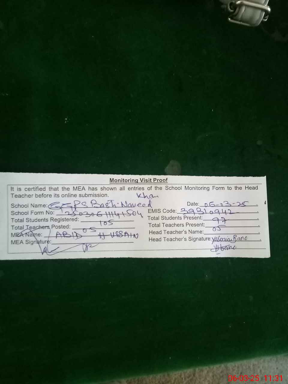 | Attendance Register | Head Teacher | MEA with School | Visit Proof |