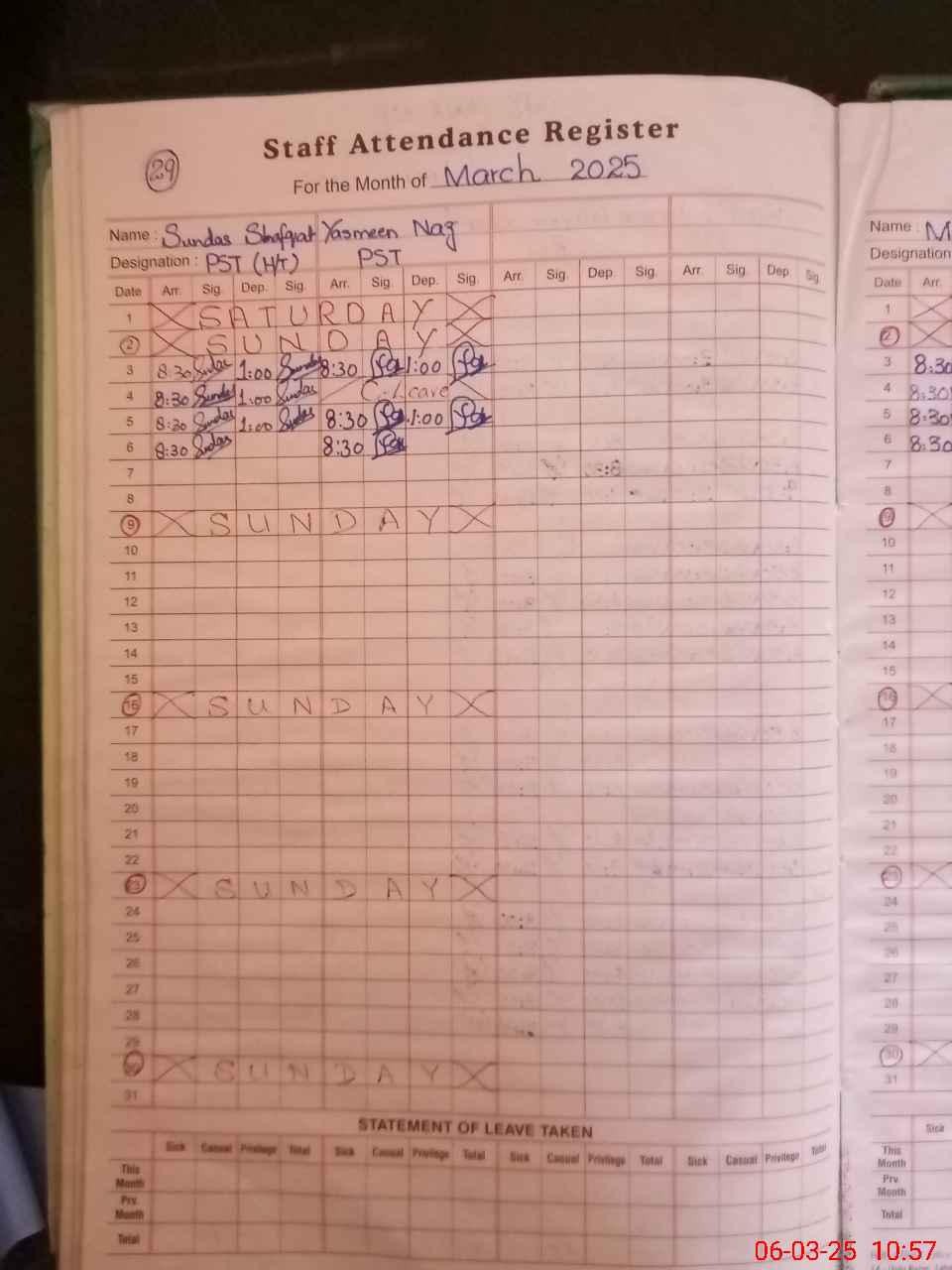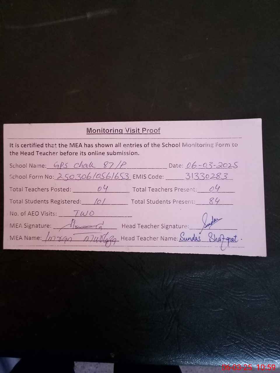 | Name: SU**** SH**** Designation: (School Headmaster's/Headmistress's) PST Phone/Cell Number: 03**** |