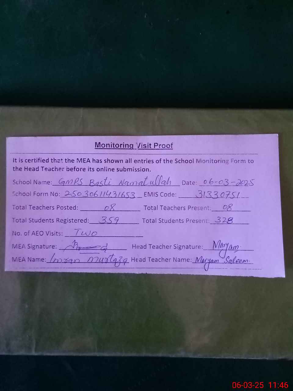 | EMIS Code: 31330751 | Name of School: GMPS BASTI NAMAT TULLAH | |||