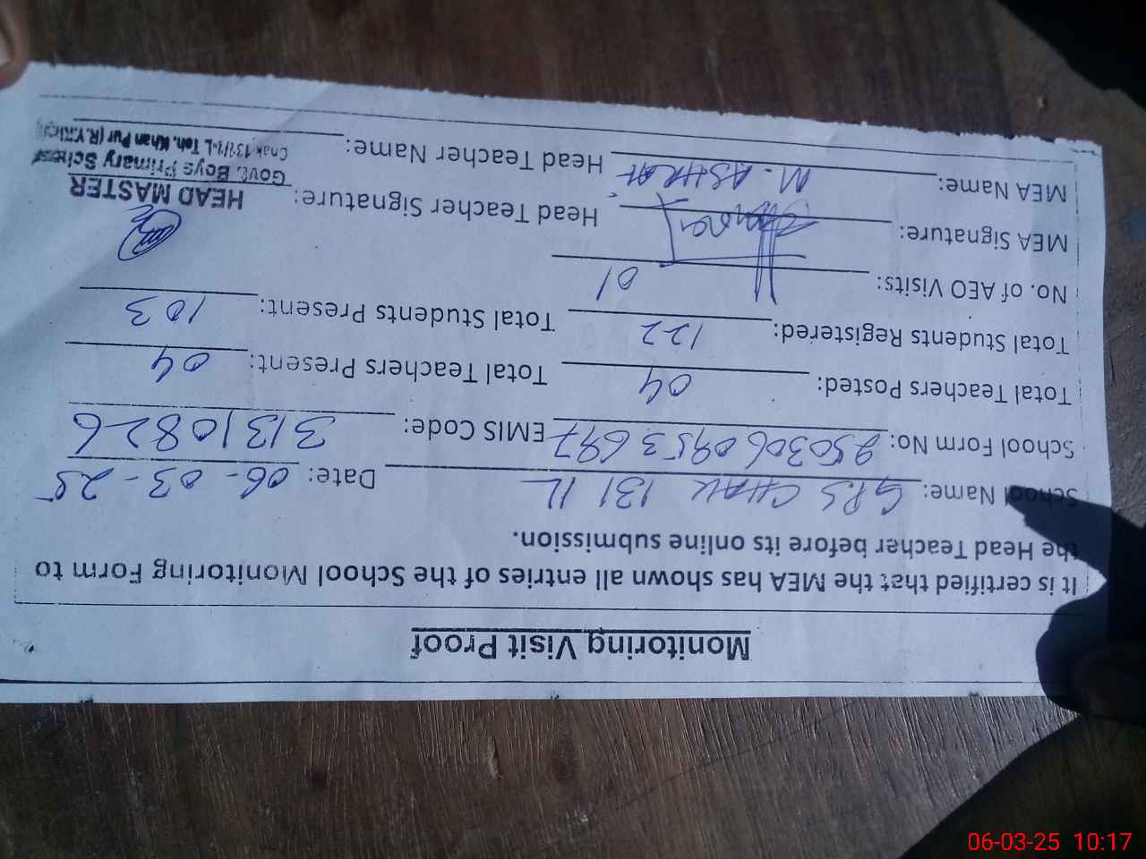 | Remarks (Use Separate Page if Required): ATTENDENCE NOT MARKED ON SIS ENROLLMENT TAKEN FROM ATTENDENCE REGISTERS OF STUDENTS ATTENDENCE OF STUDENTS CARRYOUT BY HEAD COUNT AS PER MEAS SOP VERIFICATION OF STUDENTS CLASS III NOT UPLOADED AS PER ENROLLMENT REGISTERS OF STUDENTS BOUNDARY WALL IS NOT AVAILABLE SINCE 2019 | |||||