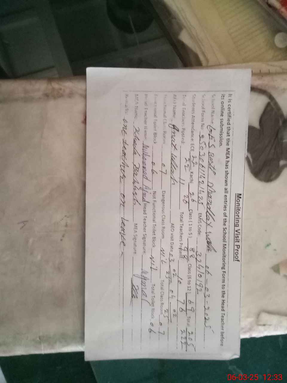 | Attendance Register | Head Teacher | MEA with School | Visit Proof |