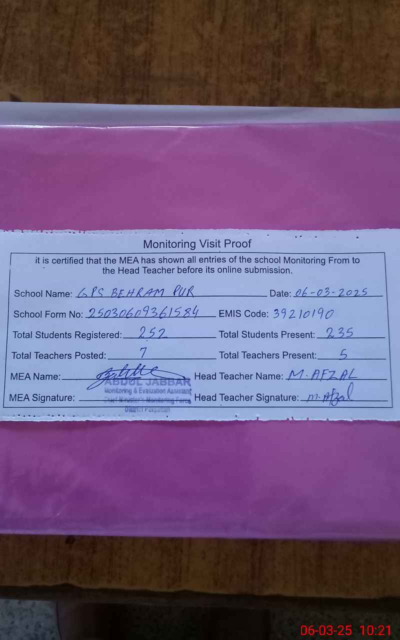 | EMIS Code: 39210190 | Name of School: GPS BEHRAM PUR PO PAKPATTAN | |||