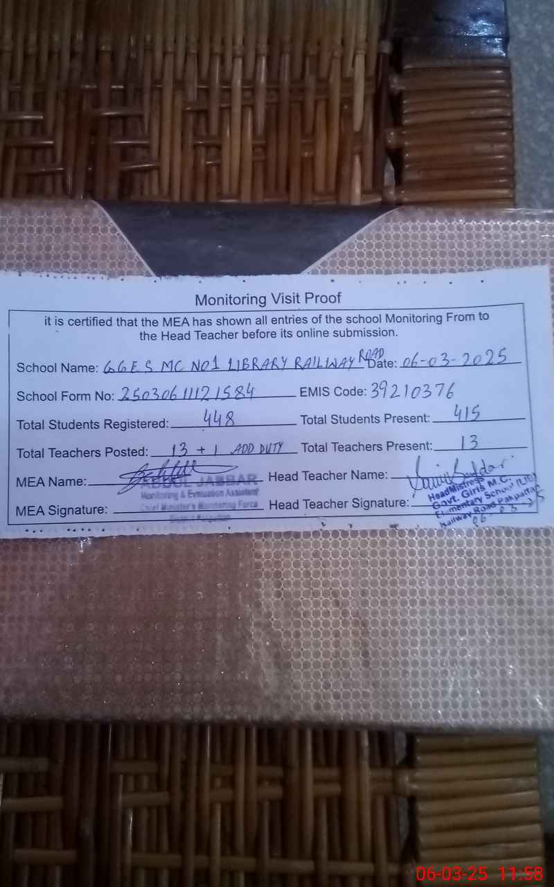 | EMIS Code: 39210376 | Name of School: GGES MC NO. 1 LIBRARY RAILWAY ROAD | |||