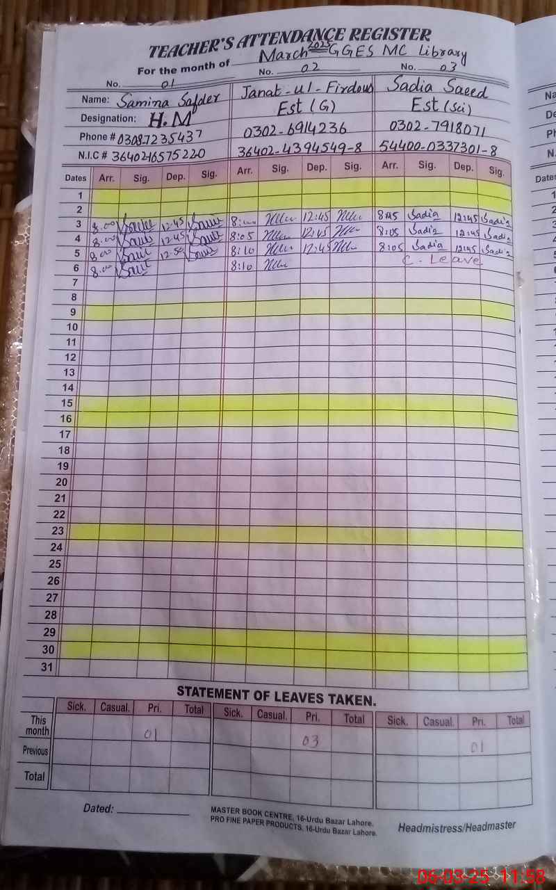 | CNIC | Full Name | Designation | R/C | Absence During Last Calender Month |