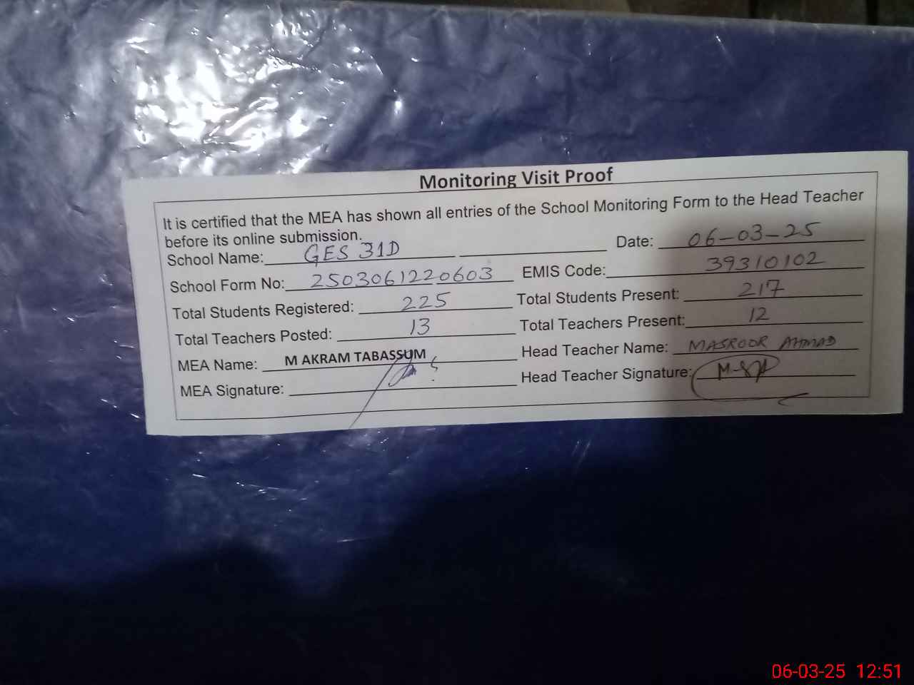 | Attendance Register | Head Teacher | MEA with School | Visit Proof |