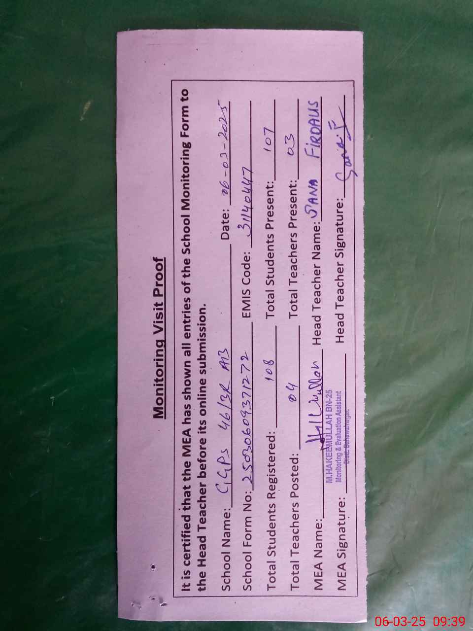 | Attendance Register | Head Teacher | MEA with School | Visit Proof |