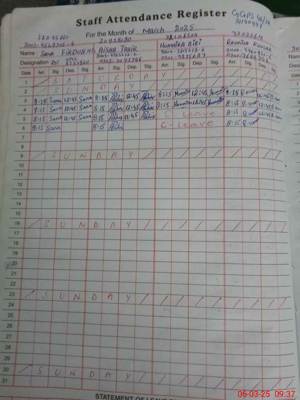 | Name: Sa**** Fi**** Designation: (School Headmaster's/Headmistress's) PST Phone/Cell Number: 03**** |