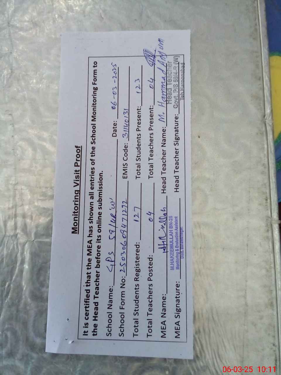 | Attendance Register | Head Teacher | MEA with School | Visit Proof |