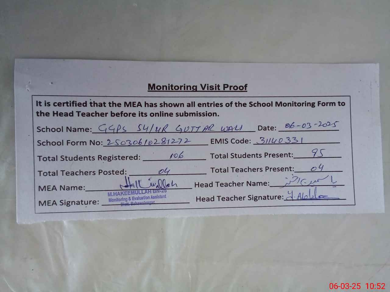 | EMIS Code: 31140331 | Name of School: GGPS 54/4R GUJAR WALI | |||