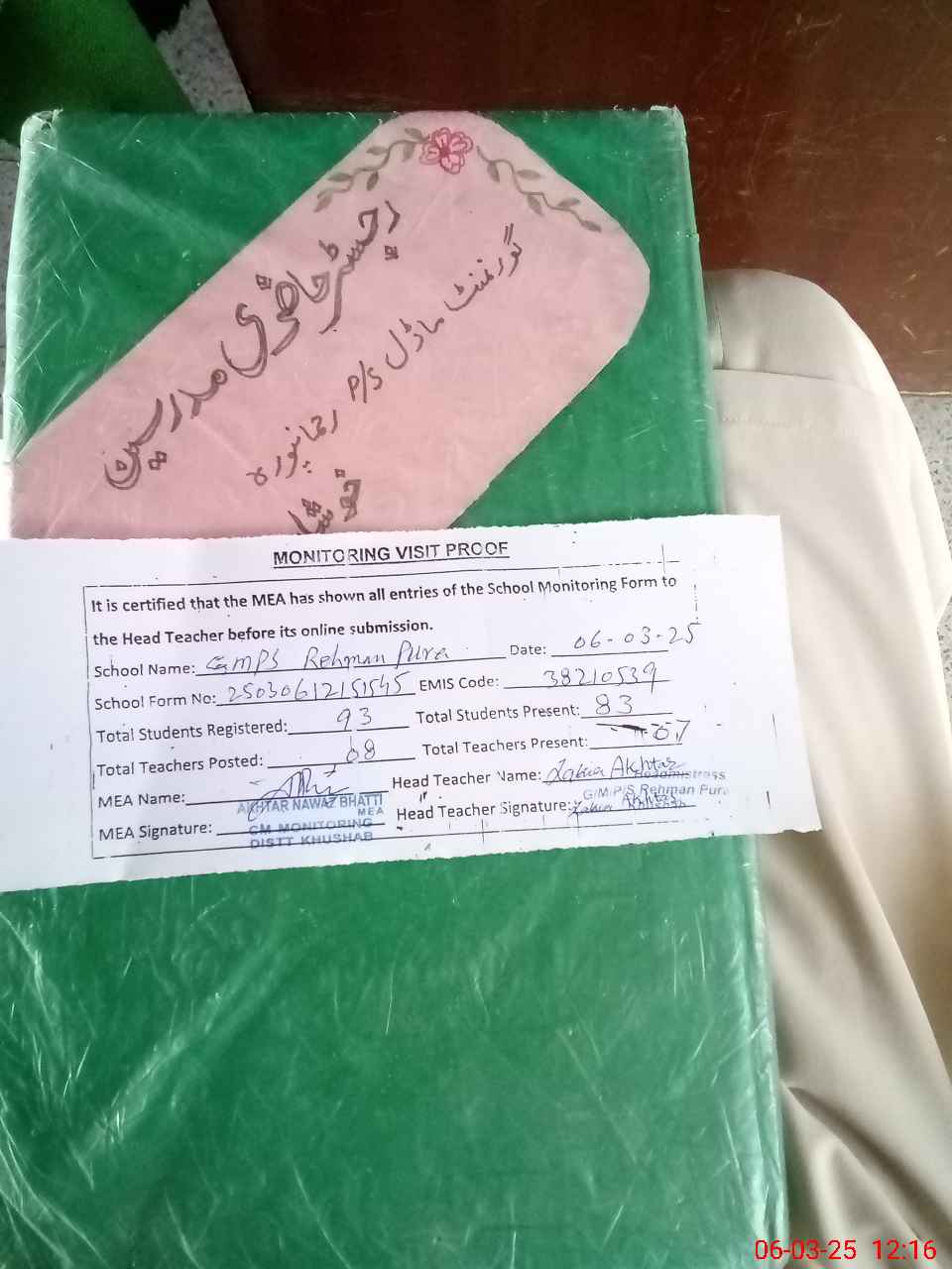 | EMIS Code: 38210539 | Name of School: GMPS RAHMAN PURA | |||