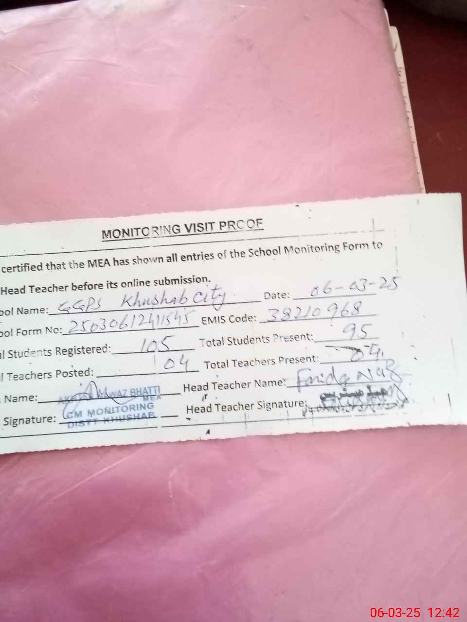 | EMIS Code: 38210968 | Name of School: GGPS KHUSHAB CITY BADLI WALA | |||